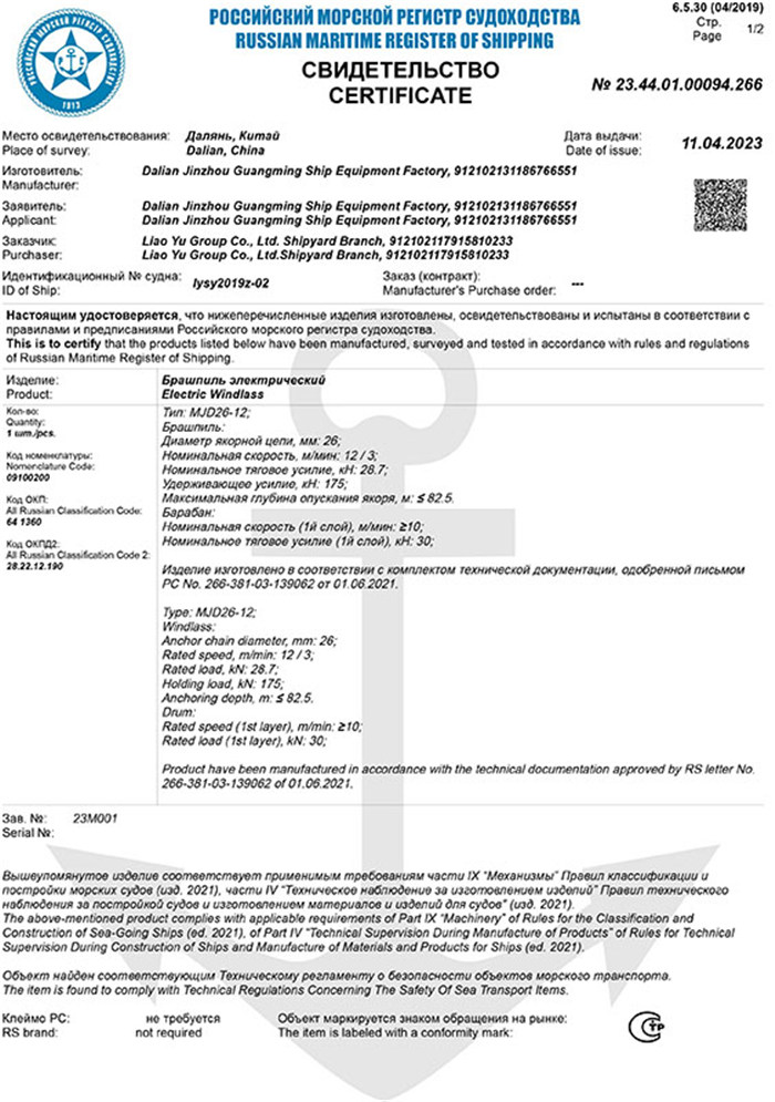 RS船用產(chǎn)品證書(吊機)
