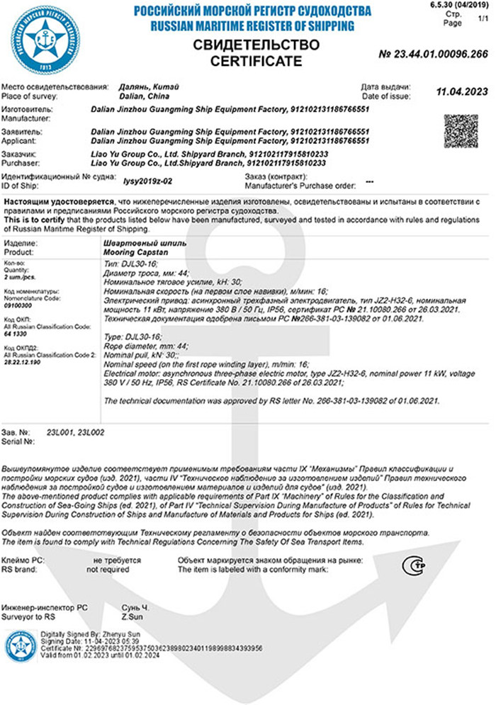 RS船用產(chǎn)品證書(錨機(jī))